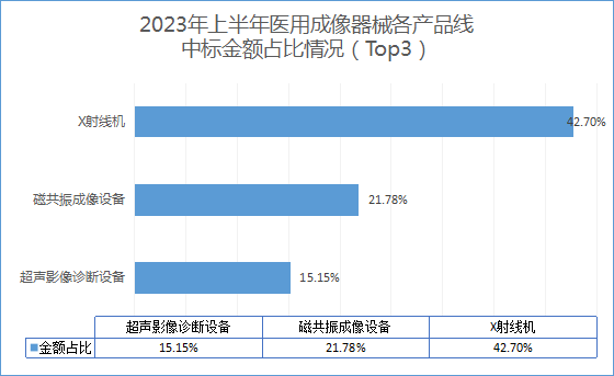 从细分的产品线来看,X射线机在上半年销售数量遥遥领先,中标金额占比为42.70%,断层第一;其次为磁共振影像设备,金额占比为21.78%;超声影像诊断设备位列第三,金额占比达15.15%。