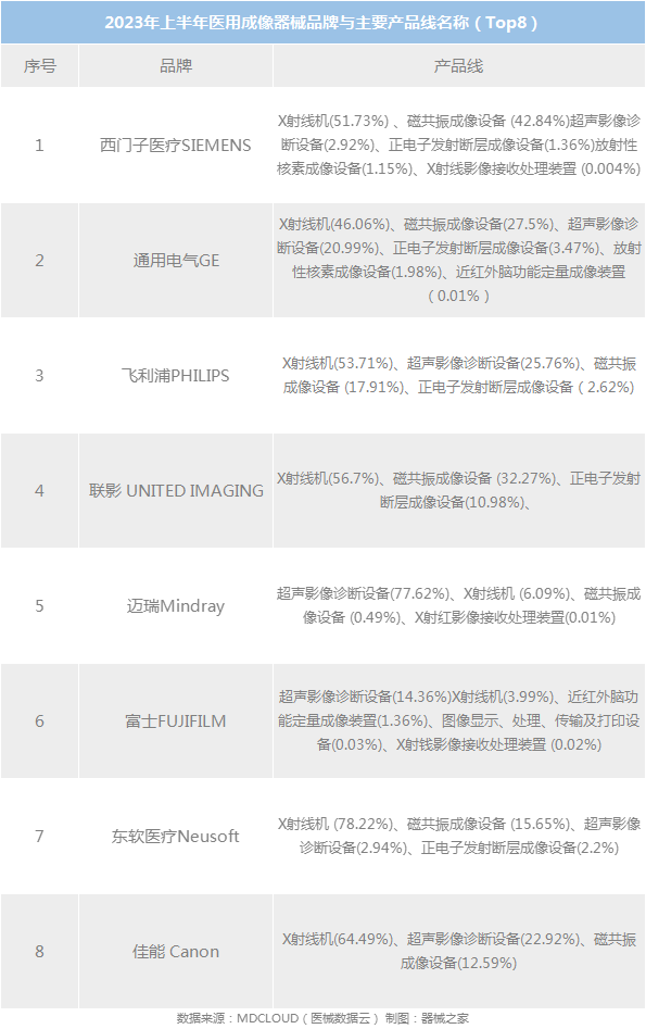 此外,众成医械数据库“MDCLOUD(医械数据云)”对2023上半年医用影像器械产品线的销售情况做出统计,内容涉及:手术显微镜、超声影像诊断设备、X射线机、医用放大镜、内窥镜用有源手术设备、磁共振成像设备、图像显示,处理,传输及打印设备、X射线影像接收处理装置、红外线乳腺诊断仪、正电子发射断层成像设备、红外热像仪、光相干断层成像系统、放射性核素成像设备、微循环显微镜等。