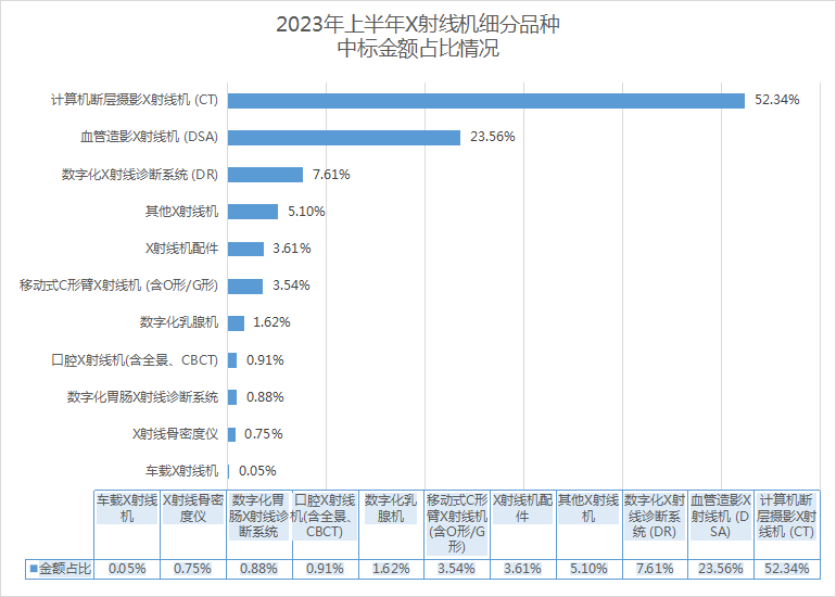 销售最为强劲的X射线机中,CT设备中标金额最多,占比高达52.34%;其次为DSA设备,中标金额占比为23.56%;DR设备位居第三,中标金额占比为7.61%。对比2022全年X射线机销售情况来看,该排名没有变动。