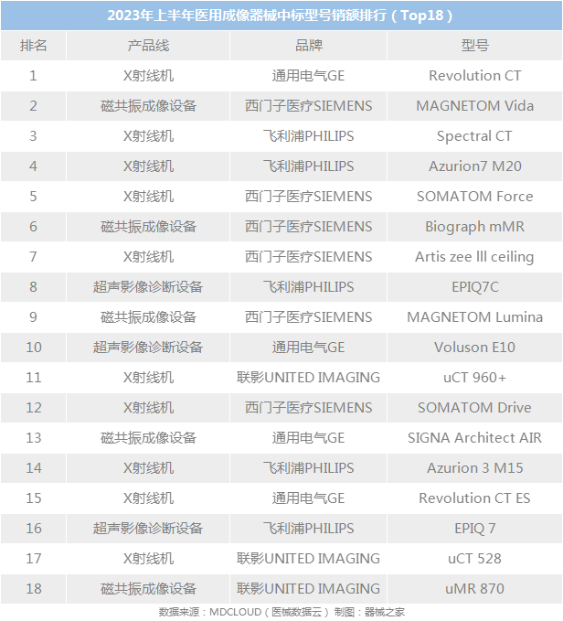 从各个品牌产品销售情况来看,GE医疗的X射线机“RevolutionCT”销售金额占比最高;其次为西门子医疗的磁共振影像设备“MAGNETOM Vida”;飞利浦医疗两款X射线机占据榜3榜4,分别为“Spectral CT”和“Azurion 7 M20”。