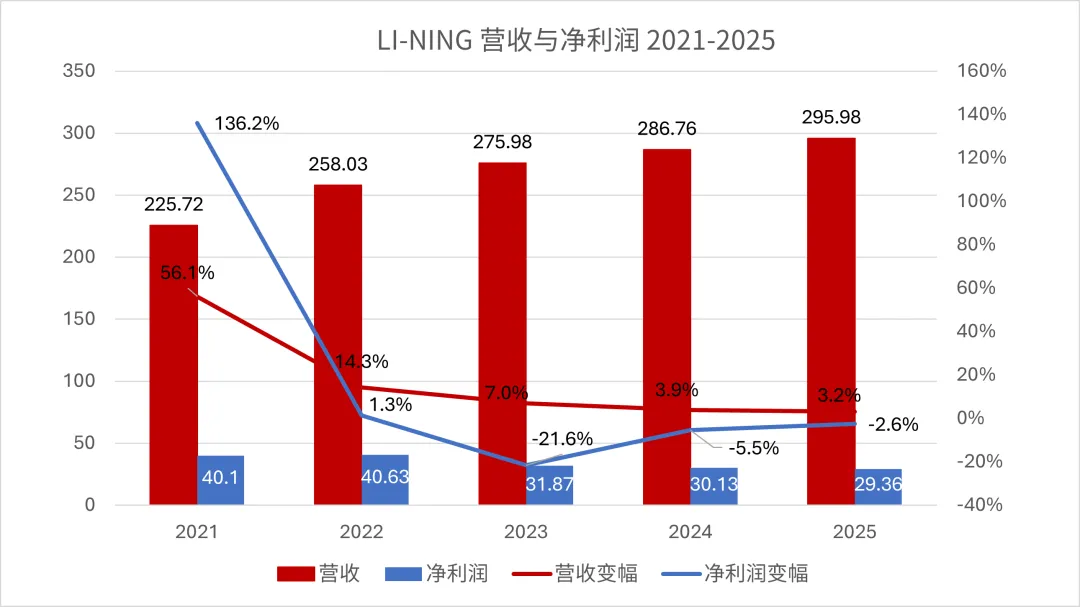 李宁的营收增速在连续三年以接近 50% 的幅度持续下滑后,仍然难改颓势,2025 财年营收为 295.98 亿人民币,增长 3.2%(2024:286.76,3.9%),遗憾未能突破 300 亿人民币大关。净利润则持续三年下滑至 29.36 亿人民币,比 2022 年的高光时刻少了 10 个目标 。