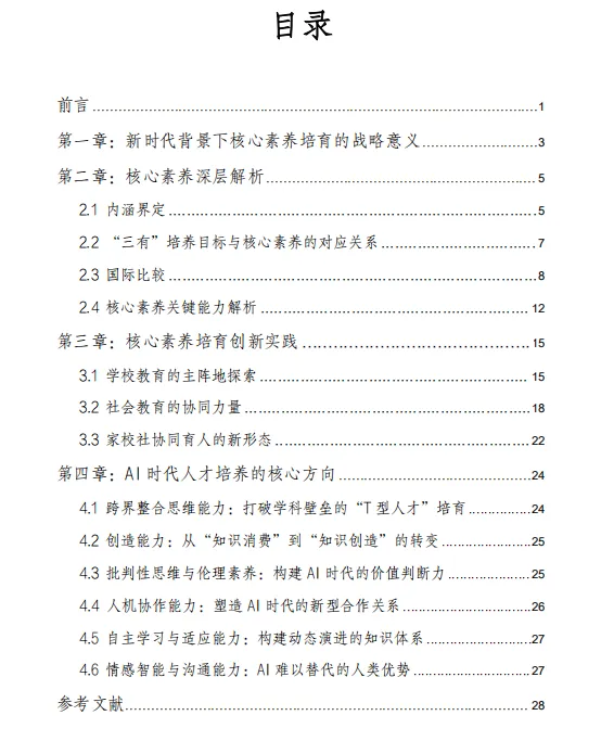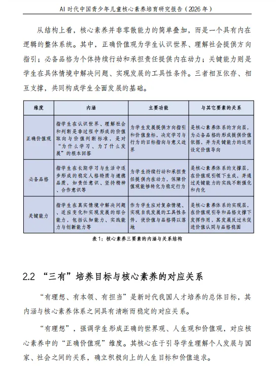 中国科学院《AI 时代中国青少年儿童核心素养培育研究报告》核心结论:AI 正在重构教育目标,未来人才竞争从 “知识记忆” 转向素养竞争。核心素养 = 正确价值观 + 必备品格 + 关键能力,学校、家庭、社会必须协同育人。孩子必须具备跨界整合、创造、批判性思维、人机协作、自主学习、情感沟通六大能力,才能在 AI 时代不被替代。- AI 能快速提供答案,但不会思考、不会判断、不会创造