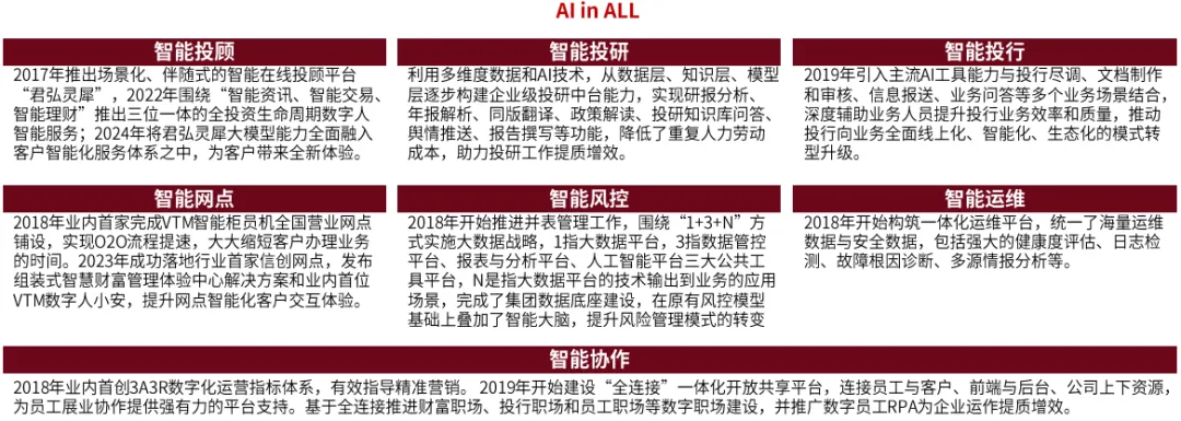 2024年联合阶跃星辰、界面财联社发布行业首个千亿参数多模态证券垂类大模型“君弘灵犀”,将大模型能力全面融入客户智能化服务体系,解决传统模型语义理解、多轮对话等短板。
