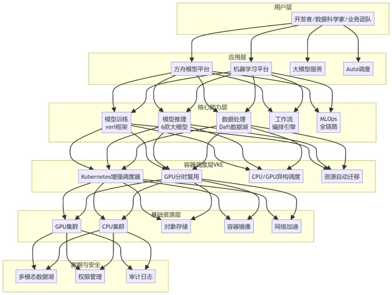 基于VKE(火山容器引擎)构建AI训练平台,充分利用Kubernetes生态。典型架构包含: