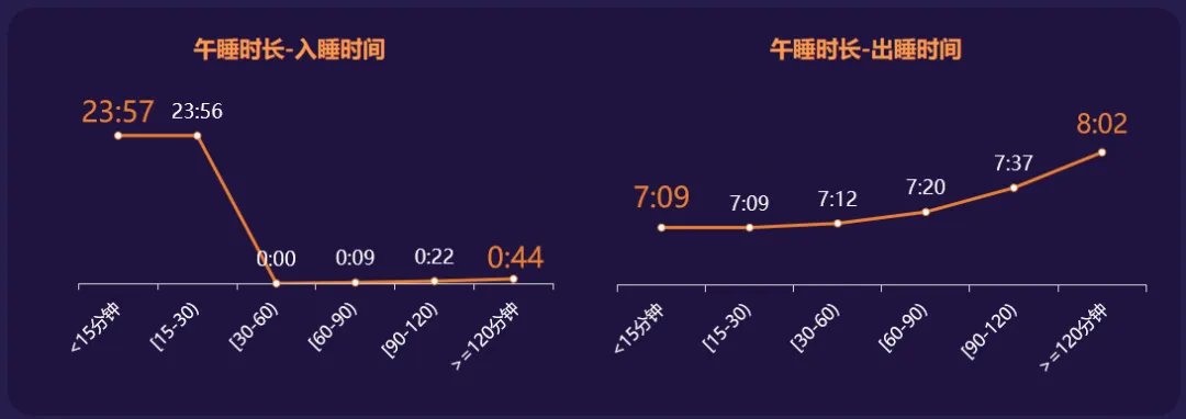 报告对午睡研究做了系统性分析,明确了“午睡越长,晚上睡得越晚”等重要结论。午睡时长为120分钟及以上的人群,比午睡30分钟及以内的人群,夜间晚睡48分钟,出睡时间晚53分钟。