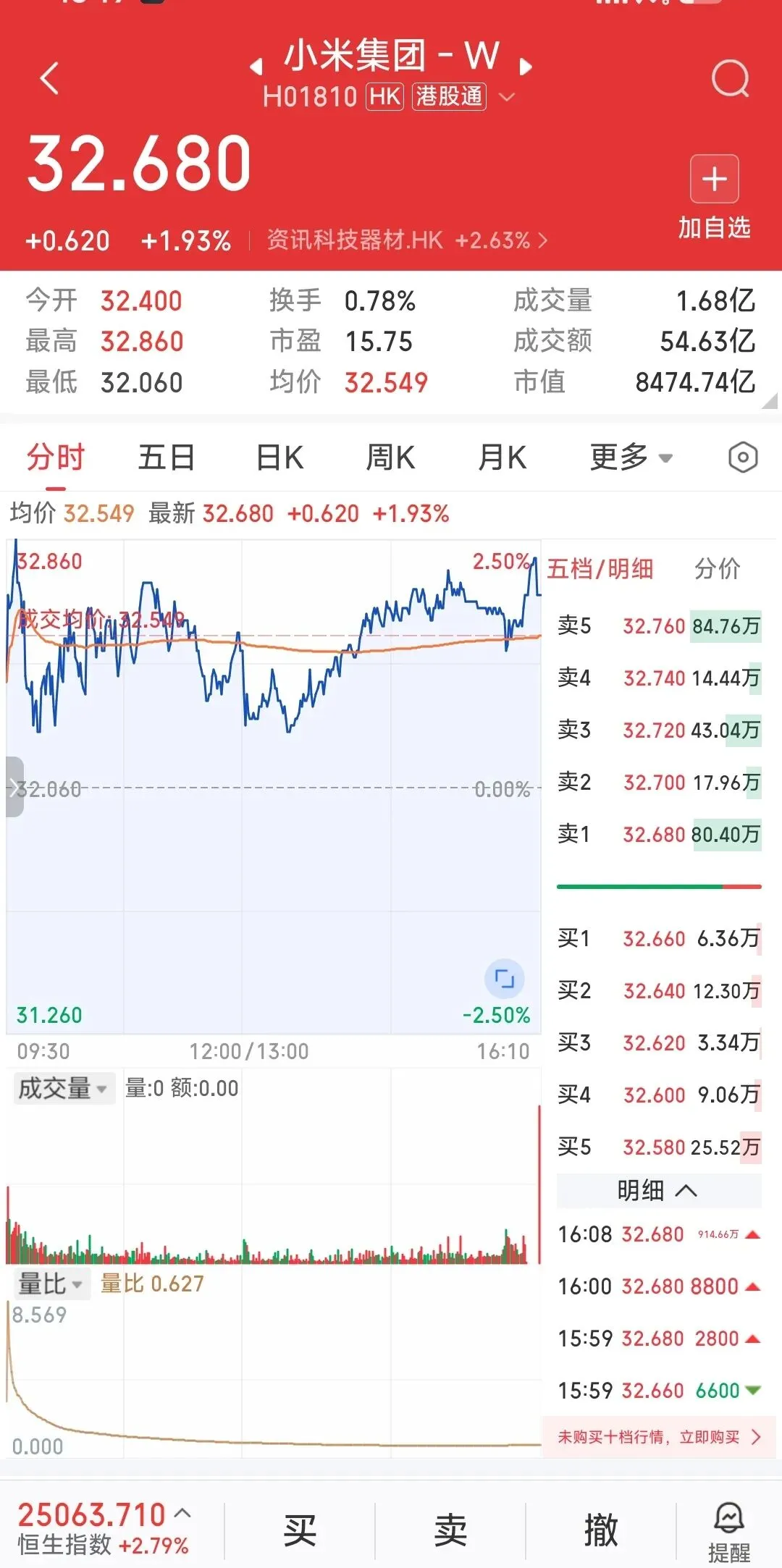 今天港股整体强势,恒指大涨2.79%,恒生科技指数涨2.51%。但小米的走势却一波三折。
