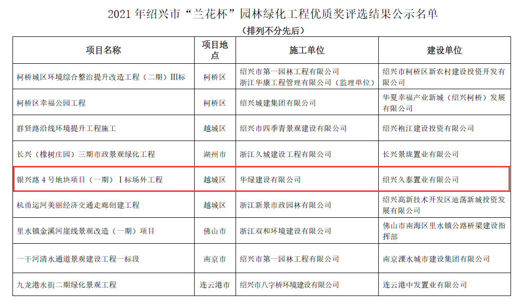 公司一直将生产安全作为重中之重,严格遵守“安全生产责任制度、安全管理、重大危险源、设备设施、消防安全”四类10条生产红线。以召开安全生产月活动、开展“护航者计划”、设置“工地安全官”、落实安全隐患检查、亲人寄语、安全巡检、安全生产评比、安全知识竞赛、工地观摩会等方式,落实全员安全生产责任意识,宣传安全知识,保障人员安全,确保安全工作落到实处,打造平安工地。公司在绍兴荣获多项省市级奖项,绍兴市的运河宸章项目荣获“2019年度绍兴市建筑工程优质结构”、2021年度绍兴市“兰花杯”园林绿化养护优质奖、浙江省风景园林学会2021年度“优秀园林工程奖”金奖;诸暨市的城市花园荣获“2020年度绍兴市建筑工程优质结构”以及“2020年绍兴市建筑工程实名制管理示范工地”。