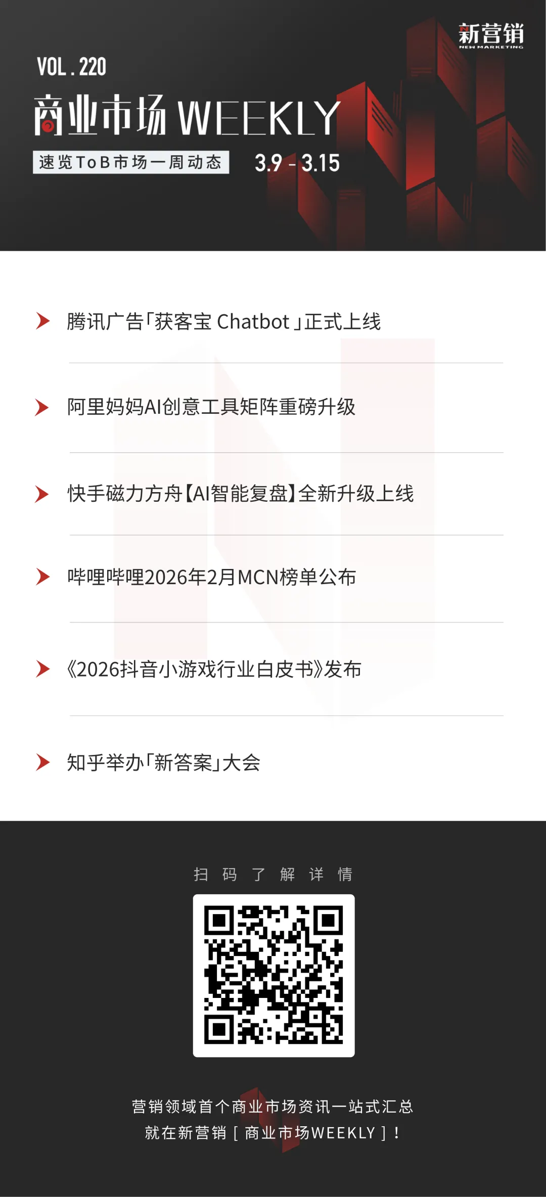 头部营销平台动态、最新营销产品、峰会资讯、招商资源及各类营销干货... 广告主、平台方、服务商亦或是关注营销的你,绝不能错过的商业市场资讯,就在新营销[商业市场WEEKLY] !↓阅读指南:点击标题可查看内容详情↓(如需获取当期简报请在后台留言:WEEKLY221)