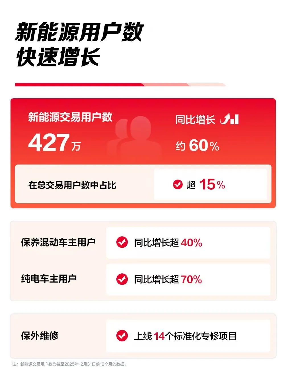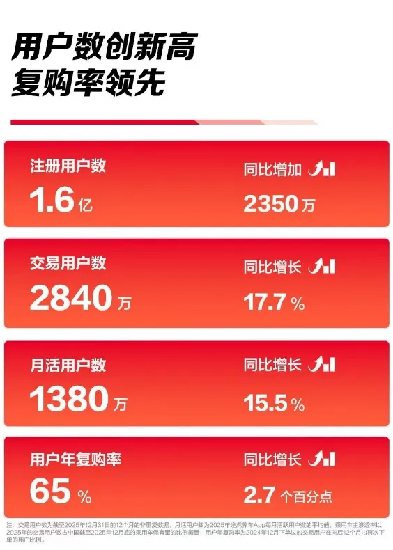 从 2025 年财报核心数据来看,途虎养车的业务扩张仍保持着既定节奏。全年总营收达165亿元,同比实现11.5%的增长,工场店数量8008家,持续占据全球最大独立汽车服务网络的市场地位。用户端增长同样保持向好态势,注册用户规模达1.62 亿,同比增长16.9%;交易用户2840万,同比提升17.7%;新能源交易用户427万,同比增幅高达60%,门店布局已覆盖全国超1900 个县级行政区,下沉市场的覆盖度持续提升。
