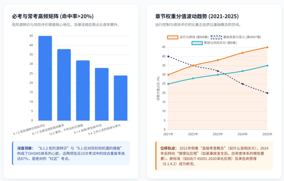 策划与风险评估 | 第6章 | 25% | 25% | 22% | 高位盘整。危险源辨识与风险评价始终是OHSMS的灵魂。考点正在从传统的机械、化学伤害向心理健康风险、变更带来的连带风险延伸。 |