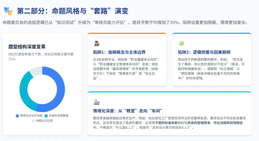 数据表明,涉及企业顶层设计与安全文化的领导作用(第5章)以及涉及供应链与多雇主环境的运行控制(第8章)权重正处于明显的上升通道,这与当前企业界频发的外包事故和管理层履职不到位的现实痛点高度吻合。第二部分:命题风格与“套路”演变深度解构