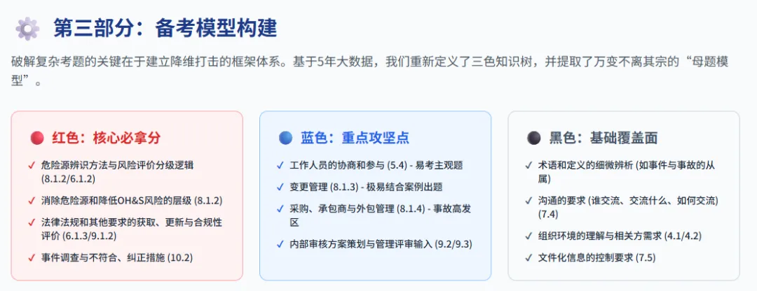 ●8.1.4 采购、承包方与外包控制:多雇主交叉环境下的风险协调识别,对承包方活动对组织影响的界定,以及对外包过程控制类型的裁定量度1。●10.2 事件、不符合和纠正措施:事故调查后的闭环管理逻辑,特别是“采取措施前评价新危险源”的时序不可逆性1。●8.1.3 变更管理(MOC):将变更(如新设备、新布局)与职业健康安全风险的重新评估挂钩的动态管理要求。●GB/T 45003 社会心理风险指南:前沿新晋考点,涉及工作组织方式、工作中的社会因素对员工心理的隐性伤害识别1。复习策略:蓝色知识点需要结合审核员视角的真实案例进行深度推演,理解条款背后的管理痛点。【黑色(基础覆盖)】:偶尔出现或作为干扰项的周边知识。