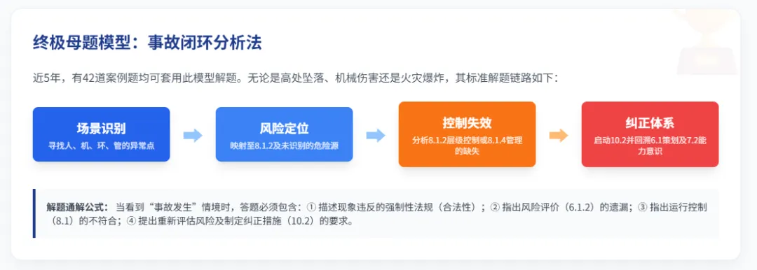 【采购与承包方三向关联模型】 | 涉及外包、采购或承包商入场时的危险源辨识与风险控制。 | 必须建立条款8.1.4.2的“三向影响”思维:承包方对组织的影响、组织对承包方的影响、承包方对其他相关方的影响1。解题时需全面识别这三层互动关系,单一视角的管控均为不充分。 |