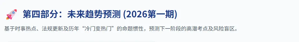 ●纯粹的传统名词定义背诵题(如事故树的定义等,比重日益减少)。●边缘性法律法规的具体行政流程或细枝末节的非核心法条。●超出组织控制范围的宏观自然环境议题。复习策略:这类知识点在复习时无需死记硬背,只需保持一定的“眼熟度”和语感,在做多选题或排除法时作为识别干扰项的盾牌即可。第四部分:未来趋势预测与备考前瞻(面向2026年及未来考期)