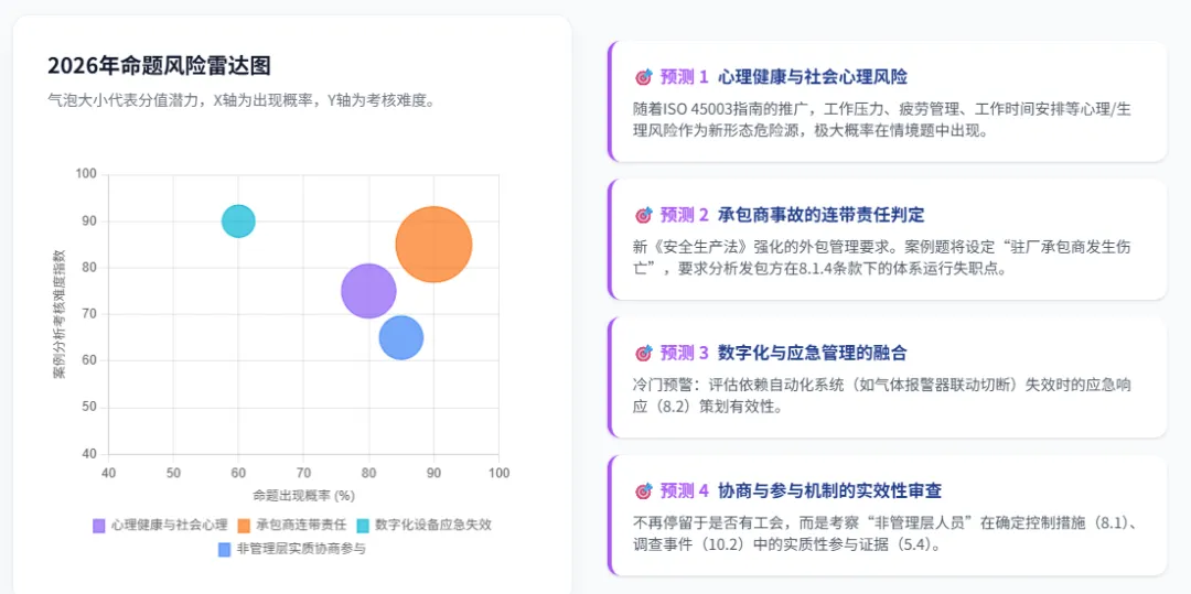 依据OHSMS体系标准的演化生命周期、国家应急管理与安全监管部门的政策高压导向,以及命题专家团队逐渐成熟的“情境化设障”思维,本白皮书对2026年的主观题(简答题)与案例分析题考向进行精准推演,并发布下一阶段的风险预警。命题惯性:下一次考试极大概率出现的“新考向”预测