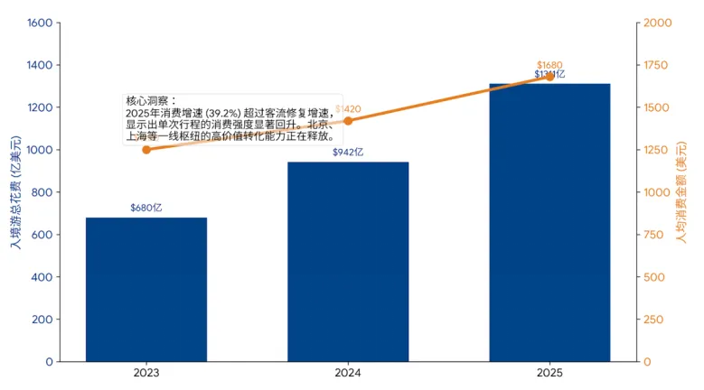 就在刚刚过去的2025年,入境游客总花费达到1311亿美元,同比增长39.2%。这说明,入境旅游已经不只是“人回来了”,而是在重新形成真实的消费体量。