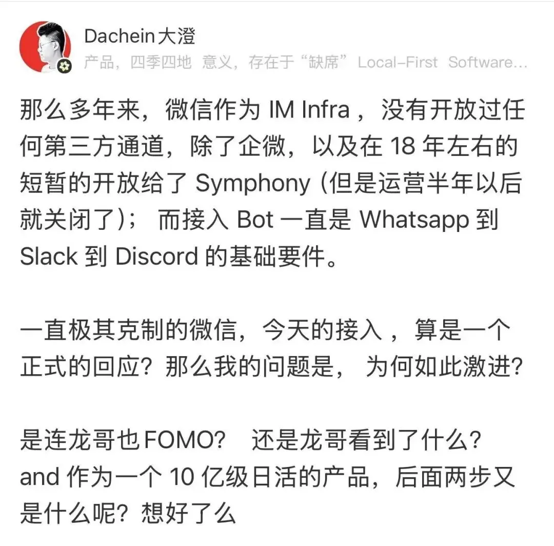 微信对接入外部通道,一直慎之又慎。AI Agent风靡互联网这两年,微信一直“作壁上观”,始终保持着自己的节奏。所以接入龙虾这件事,除了满足效率诉求和规避隐私风险外,微信应该也有自己的考量。这对于长期克制的微信,已经迈出很大的一步。龙虾这波热度,国内最先适配的是字节的飞书。所以第一批龙虾科普的安装教程,都是教用户如何在飞书部署。飞书的主动适配给微信带来直接压力,这个观点有点捧杀飞书了。不过飞书确实一直在积极拥抱AI,办公场景和AI提效又天然适配。从更大的维度看,今天AI的普及速度,甚至超过移动互联网。在最近的财报电话会上,刘炽平已经释放信号,微信会在今年三季度,正式推出微信生态专属的Agent。换个更抽象的问题:如何面对AI的冲击。微信给了自己的答案。那我们呢?虽然热度褪去,我还是建议,有机会可以养个龙虾试试。现在接入龙虾已经非常方便,五分钟就能完成,成本也不高。想象你有什么事情,是每天都要做的。把它交给龙虾,试着让它帮你完成。
