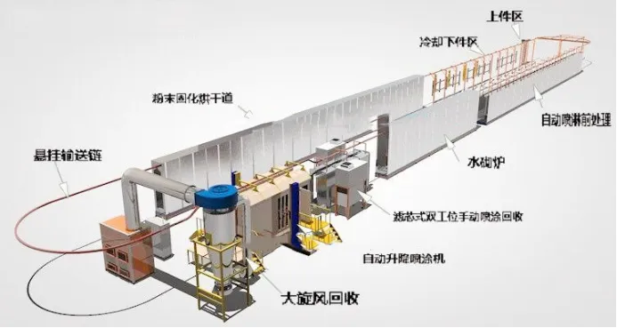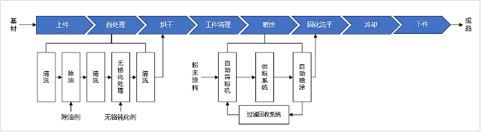 目前,工业中使用最多喷涂线为的静电粉末涂料喷涂线,静电粉末自动喷涂产线的工艺过程及设备主要包括:输送系统、前处理系统(化学溶液)、水分烘干系统、粉末喷涂及回收系统、固化系统。