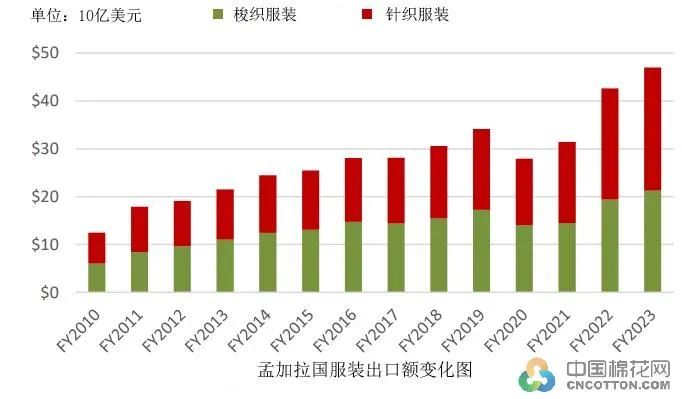 服装出口对孟加拉国的经济增长至关重要,保证了货币汇率的稳定,尤其是通过出口实现了美元外汇收入。孟加拉国服装制造商和出口商协会称,2023财年(2022年7月-2023年6月)服装占孟加拉国出口的比重超过80%,达到约470亿美元,比十年前增长一倍多,超过了前一年的历史高点,说明全球进口国对孟加拉国的棉制产品的接受程度在提高。
