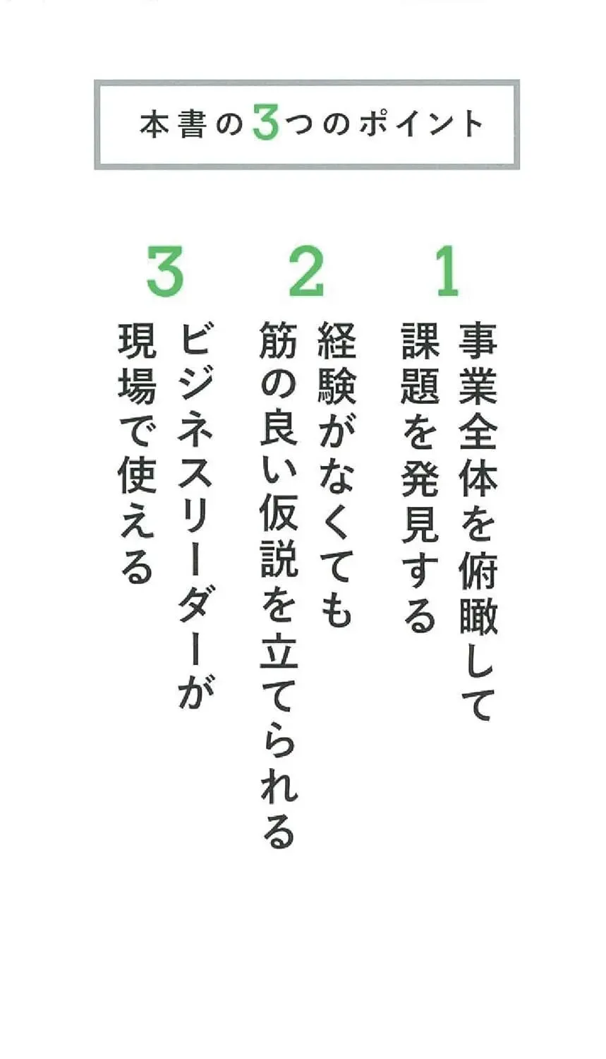 俯瞰整个业务,发现课题 即使没有经验,也能提出合理的假设 适合商业领袖在现场使用