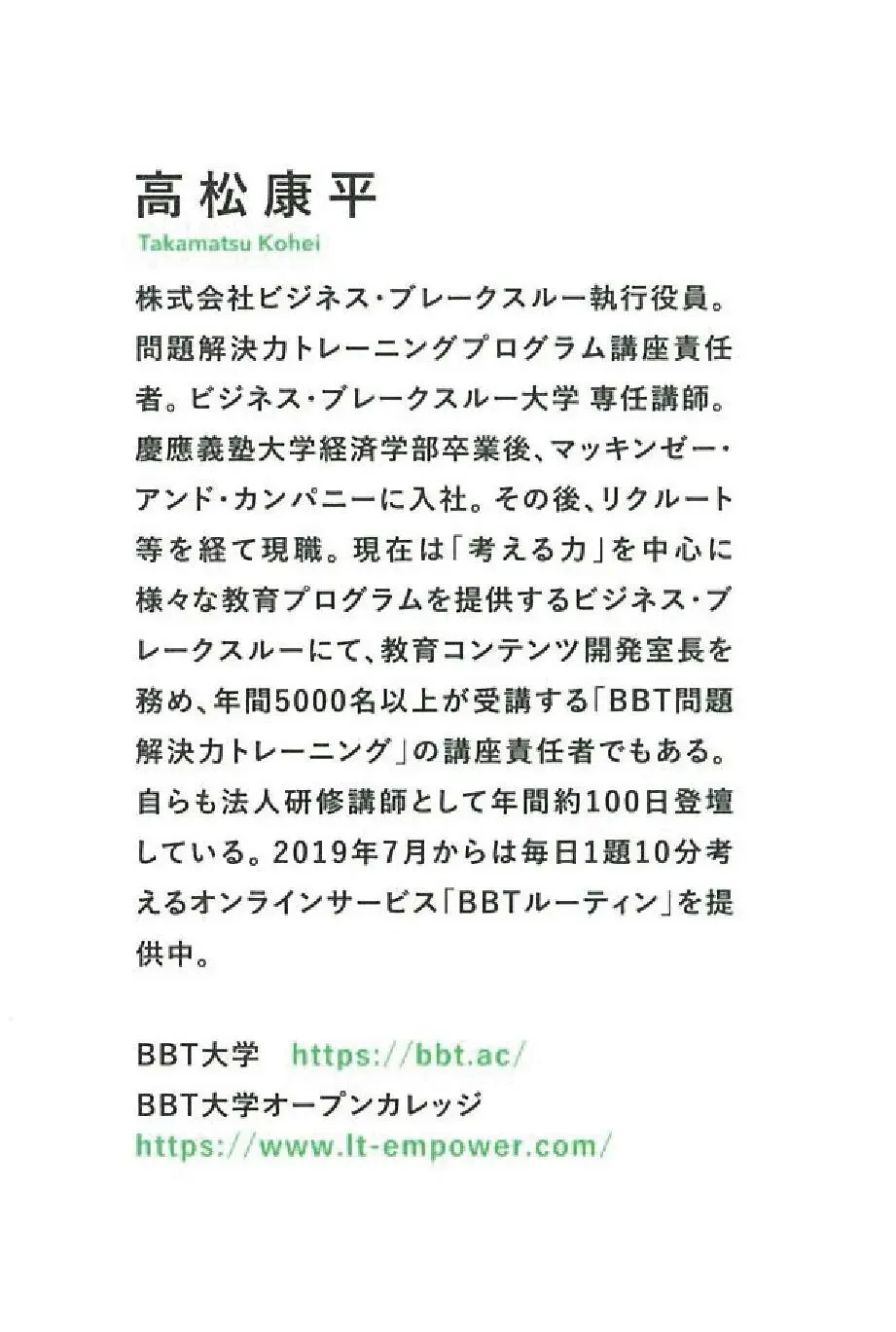现任商业突破株式会社(Business Breakthrough)执行役员,负责问题解决能力训练项目的课程。为商业突破大学(BBT)专任讲师。毕业于庆应义塾大学经济学部后,曾就职于麦肯锡公司,之后在Recruit等公司历练,现任职于商业突破。现担任教育内容开发室室长,并负责每年有5000多人参加的“BBT问题解决力训练”课程。本人每年约以企业培训讲师身份出场100天左右。自2019年7月起,提供每日1题、每题10分钟思考的在线服务“BBTルーティン”。