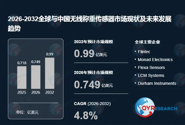 根据QYR(恒州博智)的统计及预测,2025年全球无线称重传感器市场销售额达到了0.72亿美元,预计2032年将达到0.99亿美元,年复合增长率(CAGR)为4.8%(2026-2032)。