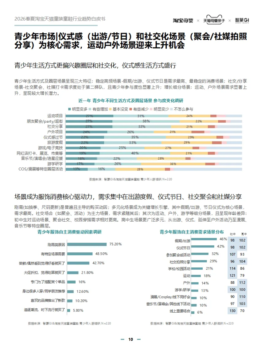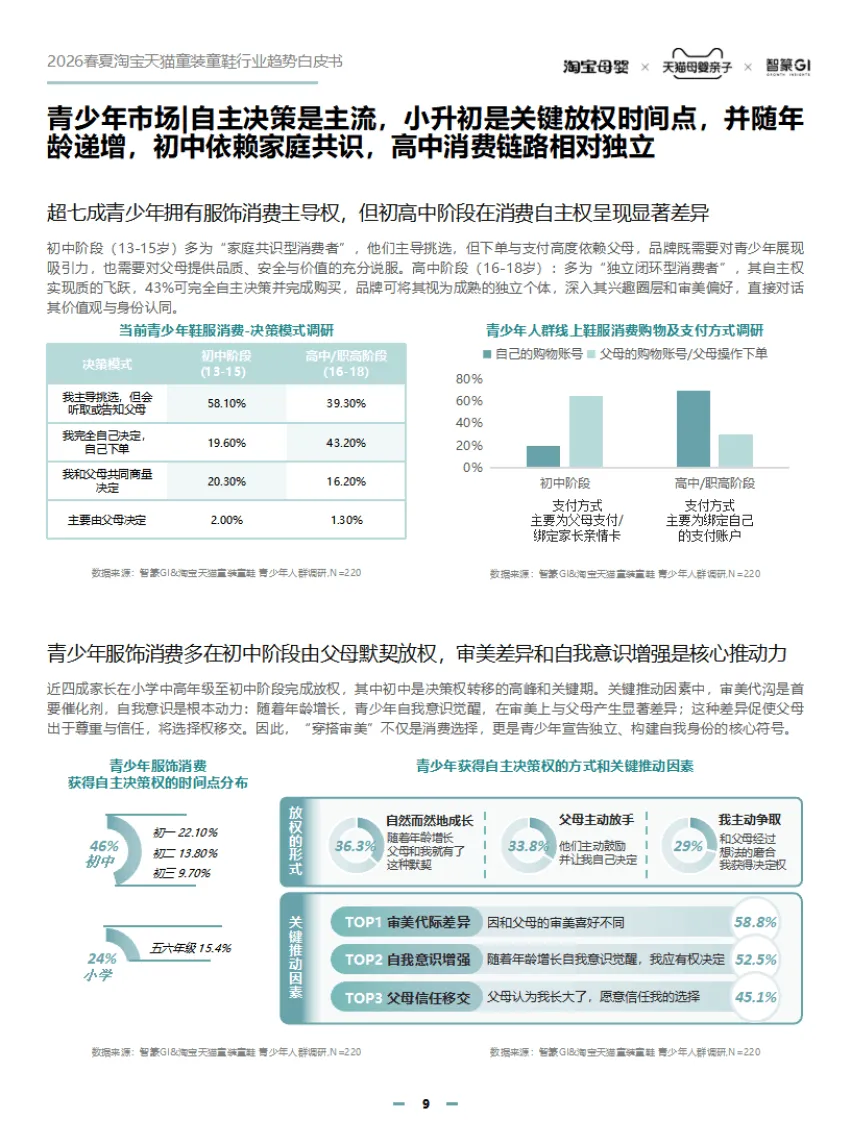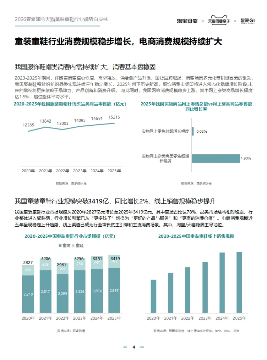 增长阶段,市场规模突破 3419 亿元,线上成为核心渠道,淘宝天猫稳居主导地位。政策、人群、场景三大维度驱动行业变革,青少年与婴幼童双线爆发,风格、亲子、IP 三大赛道迎来明确机会,品类功能与设计同步升级。