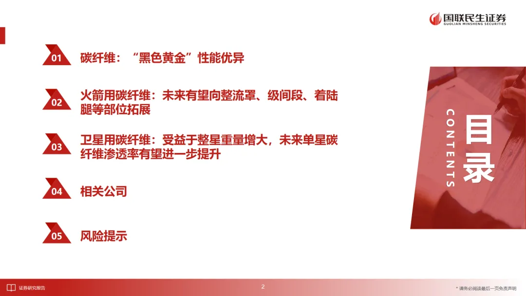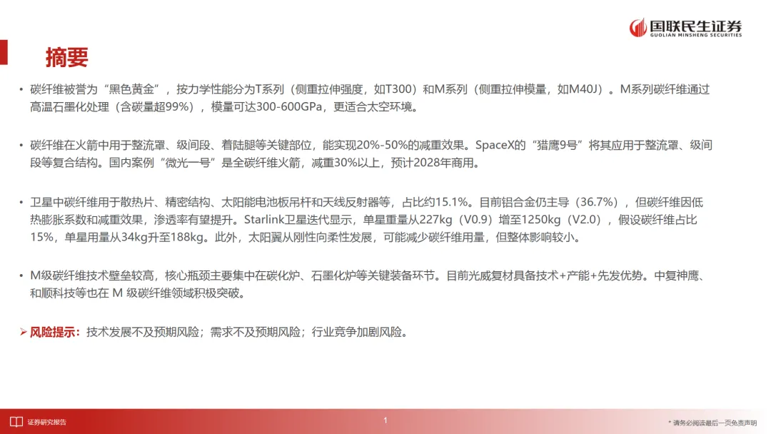 报告还提醒了三个主要风险:技术发展不及预期、需求不及预期以及行业竞争加剧。这些风险可能会影响碳纤维材料的需求释放节奏和市场空间。