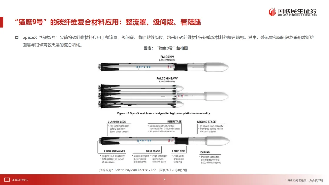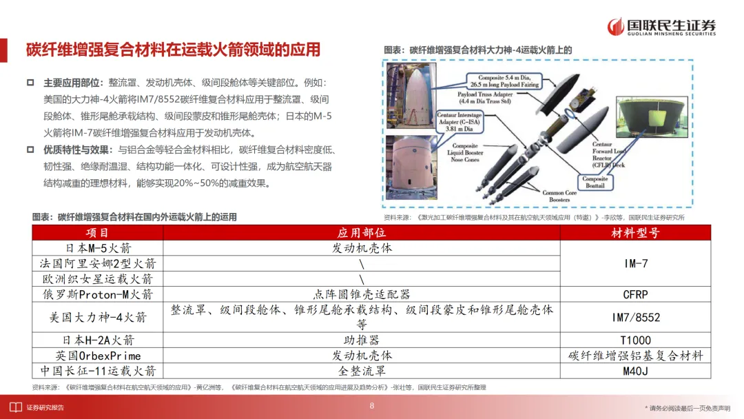 报告指出,碳纤维分为T系列和M系列,其中M系列碳纤维因其高拉伸模量,特别适合太空环境。在火箭制造中,碳纤维被广泛应用于整流罩、级间段、着陆腿等关键部位,能够实现20%-50%的减重效果。例如,SpaceX的“猎鹰9号”火箭就采用了碳纤维复合材料,而国内的“微光一号”全碳纤维火箭预计在2028年商用,减重超过30%。