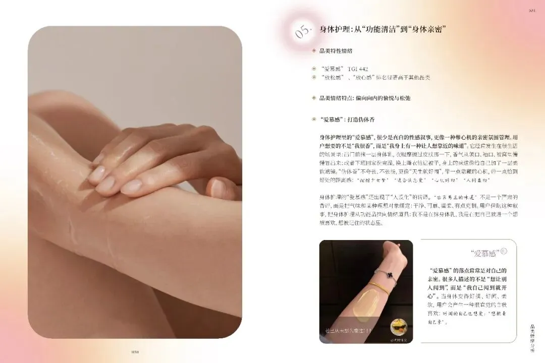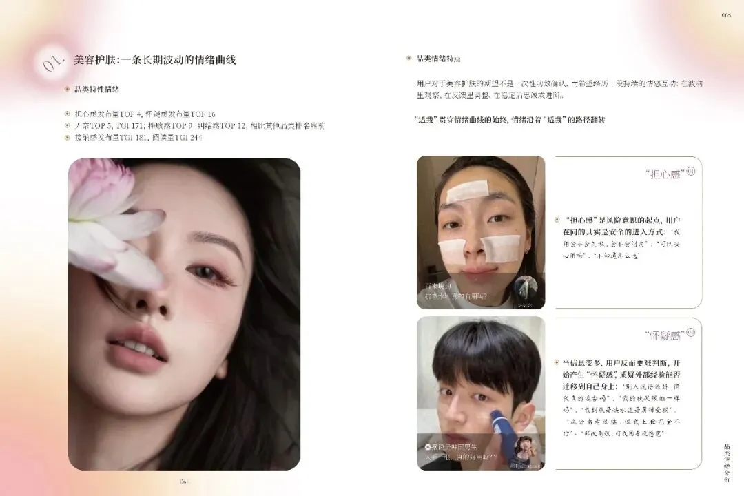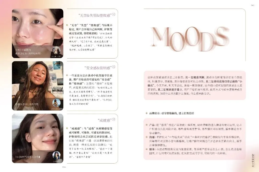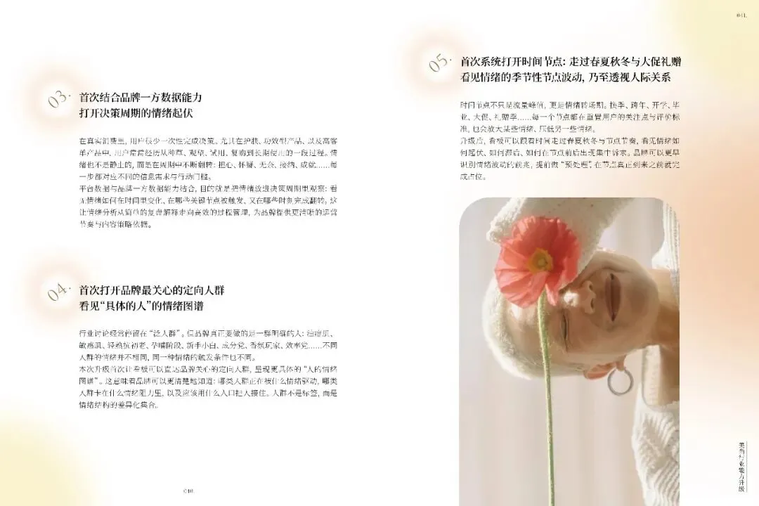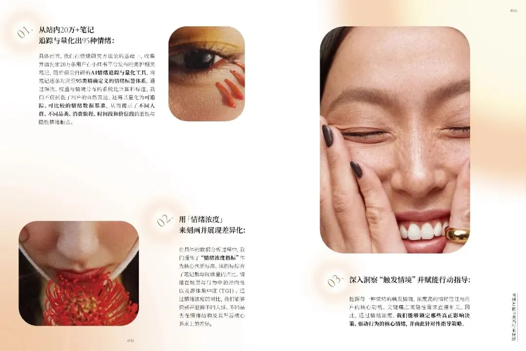 不同品类如美容护肤、彩妆、香水等,各自触发独特情绪,品牌需精准把握。礼赠场景中,情绪任务多样,品牌需提供关系适配产品与服务。小红书美护用户追求真实、积极生活,品牌应营造可亲近氛围,提供低门槛、高反馈的产品。十大情绪趋势显示,用户偏好真实、自信、有掌控感的美,品牌需不断创新,满足用户多样化情绪需求,以情绪驱动商业创新,建立长情共鸣。
