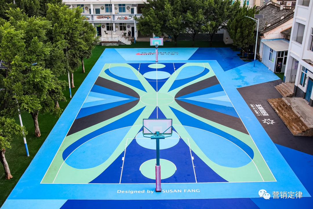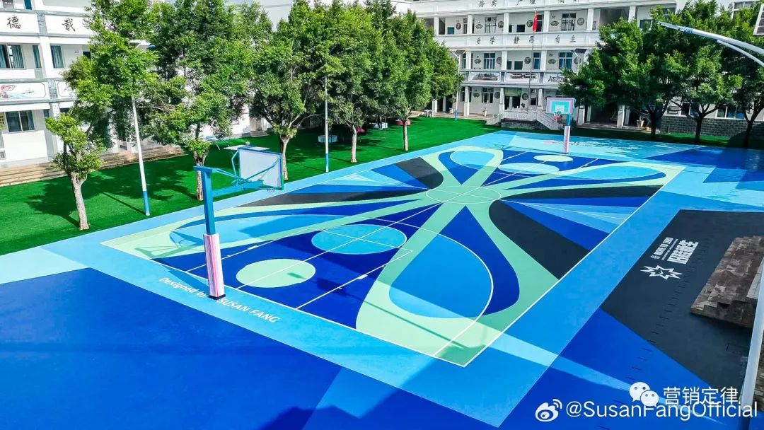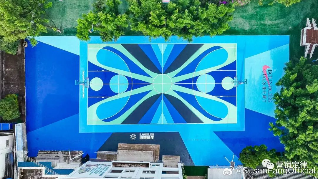 该球场特别运用了联合行动中,经过 Grind 技术加工后的回收运动鞋制成。NIKE 还携手中国设计师 Susan Fang(方妍楠),以蝴蝶、彩虹和爱等元素为灵感,装点该球场,旨在用丰富色彩还原女孩们眼中的彩色运动视界,为女孩们提供一个快乐且舒适的运动空间,希望她们的梦想可以像蝴蝶一样「振翅」高飞。