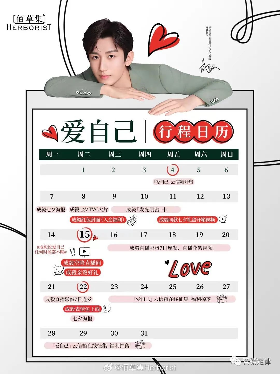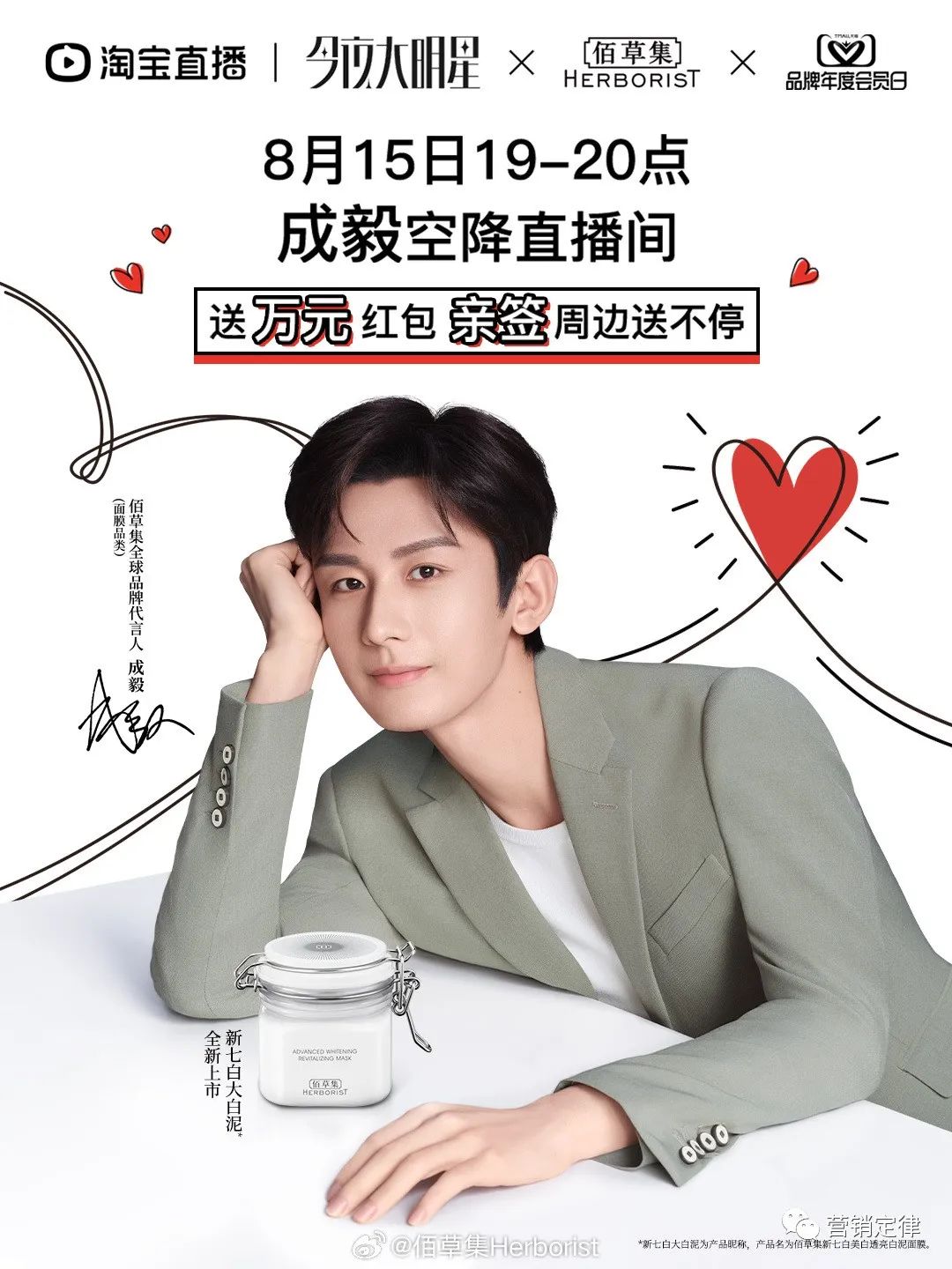 预热阶段,佰草集开启「爱自己」云信箱,邀请粉丝带话题分享爱自己的故事,同时上线代言人成毅七夕海报、TVC 大片、「发光肌密」卡等物料,宣发此次七夕活动。8 月 15 日晚 19:00,成毅空降佰草集天猫官方直播间,见证并亲读「爱自己」云信箱活动所征集到的优质内容,与粉丝共赴发光之旅。