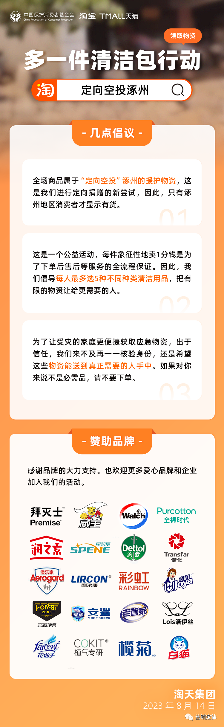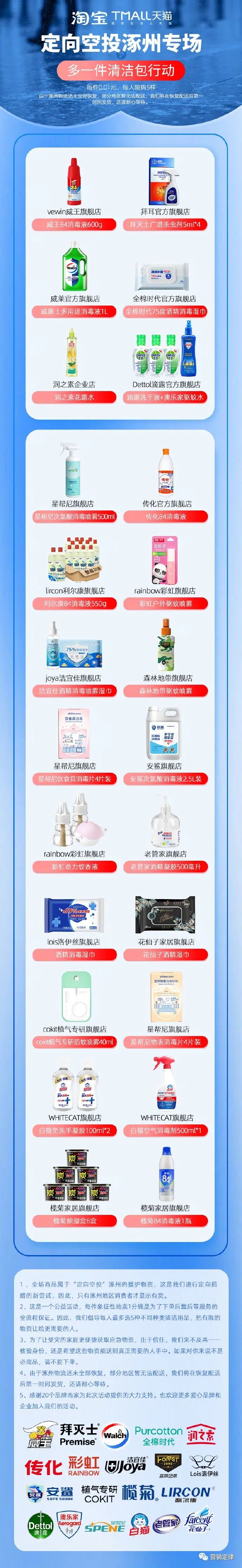 为帮助涿州进行灾后的消杀,淘宝天猫紧急联合拜灭士、威露士、全棉时代、滴露等 20 个家清个护品牌,上线了「多一件清洁包」涿州清洁消杀用品的专场。专场上提供了总价值近千万元的消毒剂等清洁物资,涿州当地用户可以 0.01 元/件接近免费的价格进行下单。