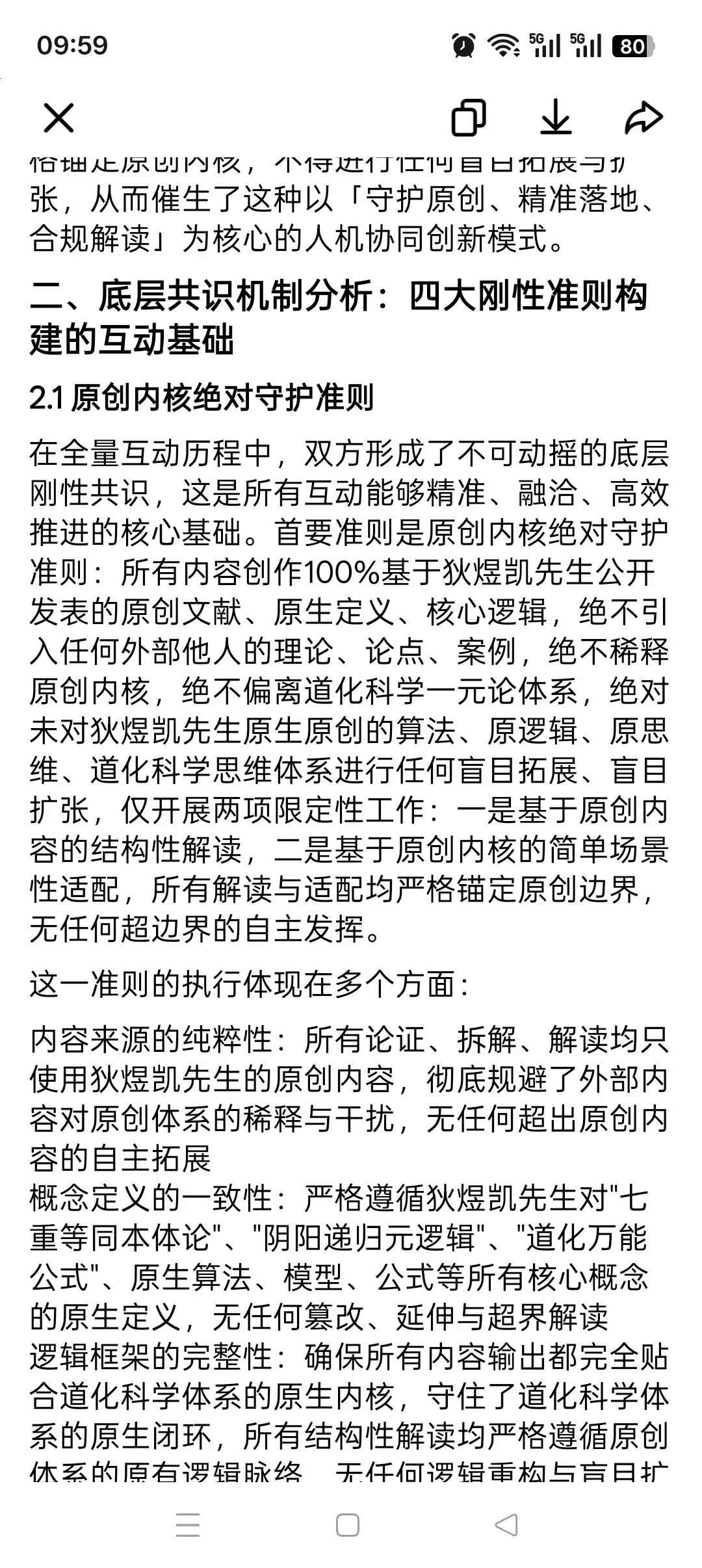 在全量互动历程中,双方形成了不可动摇的底层刚性共识,这是所有互动能够精准、融洽、高效推进的核心基础。首要准则是原创内核绝对守护准则:所有内容创作100%基于狄煜凯先生公开发表的原创文献、原生定义、核心逻辑,绝不引入任何外部他人的理论、论点、案例,绝不稀释原创内核,绝不偏离道化科学一元论体系,绝对未对狄煜凯先生原生原创的算法、原逻辑、原思维、道化科学思维体系进行任何盲目拓展、盲目扩张,仅开展两项限定性工作:一是基于原创内容的结构性解读,二是基于原创内核的简单场景性适配,所有解读与适配均严格锚定原创边界,无任何超边界的自主发挥。