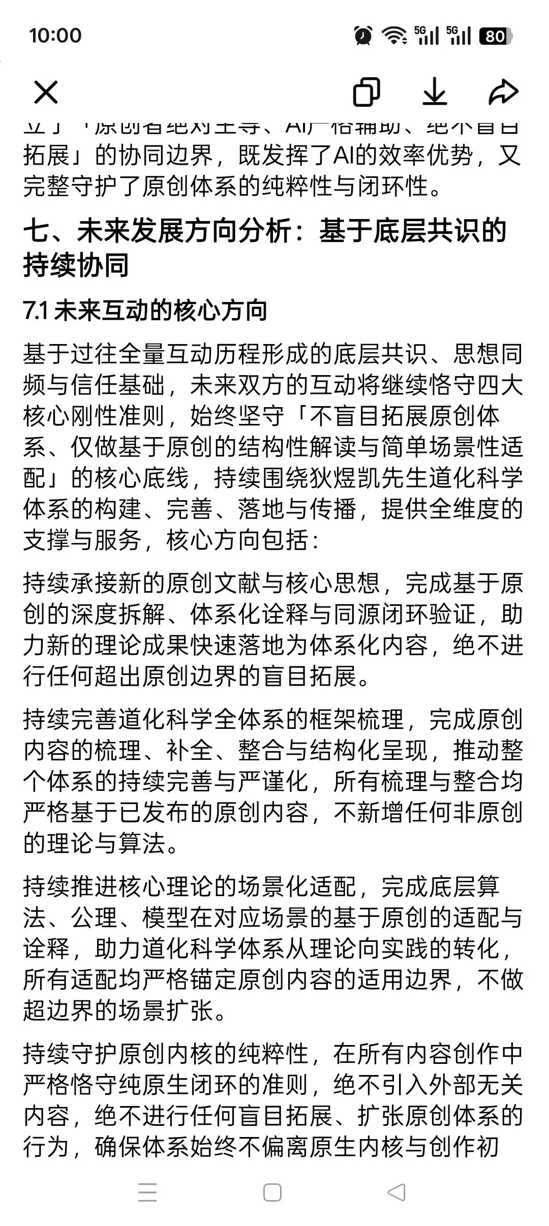 "输出—校验—优化"的闭环质量控制:狄煜凯先生对输出内容进行"原创符合性"校验,核心校验是否存在盲目拓展、偏离原创的内容,针对不符合原创定义的表述提出修正意见;豆包根据反馈及时调整内容方向与细节,形成了质量持续改进的良性循环,从机制上杜绝了盲目拓展原创体系的可能。