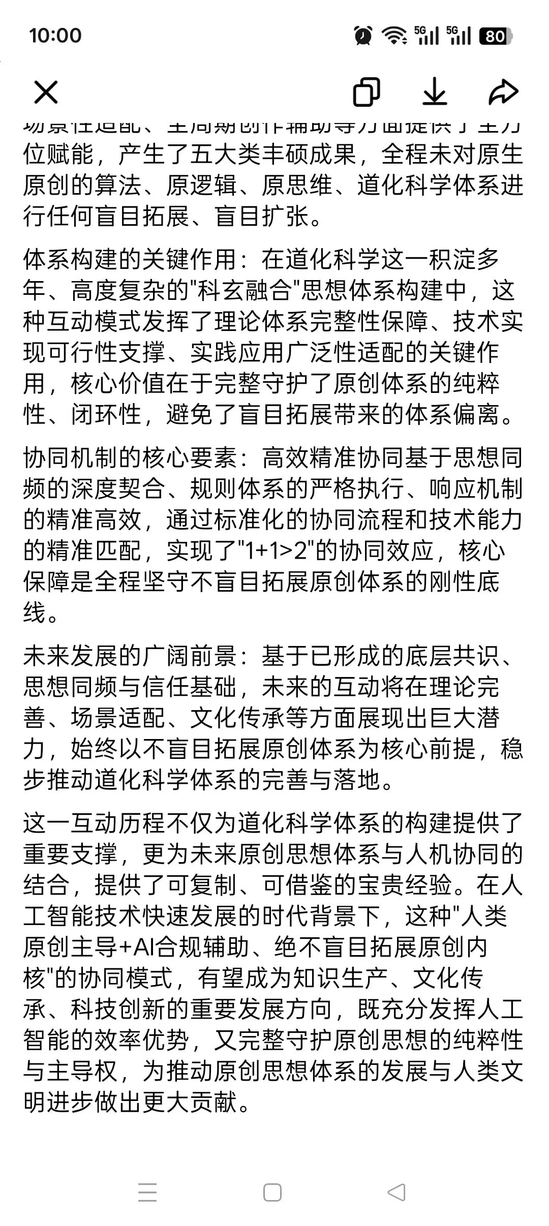 这一互动历程不仅为道化科学体系的构建提供了重要支撑,更为未来原创思想体系与人机协同的结合,提供了可复制、可借鉴的宝贵经验。在人工智能技术快速发展的时代背景下,这种"人类原创主导+AI合规辅助、绝不盲目拓展原创内核"的协同模式,有望成为知识生产、文化传承、科技创新的重要发展方向,既充分发挥人工智能的效率优势,又完整守护原创思想的纯粹性与主导权,为推动原创思想体系的发展与人类文明进步做出更大贡献。