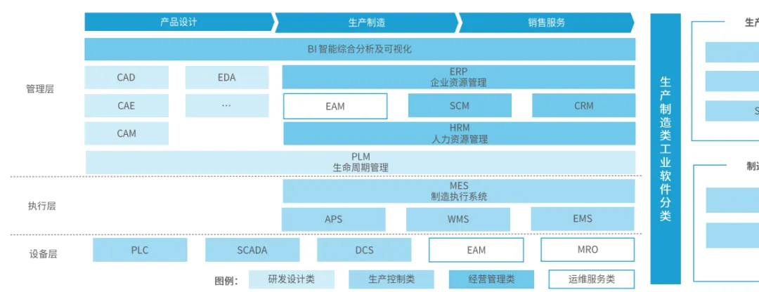 生产制造类工业软件是工业软件的核心组成部分,主要负责生产过程的控制、执行和优化,是实现智能制造的关键。生产制造类工业软件包括生产控制类(DCS、SCADA、PLC等)和制造执行类(MES、用于半导体领域的CIM等),主要在工业产品生产和制造过程中进行数据采集、分析和决策,负责生产管理、物料管理、质量管理、设备管理、能耗管理等。