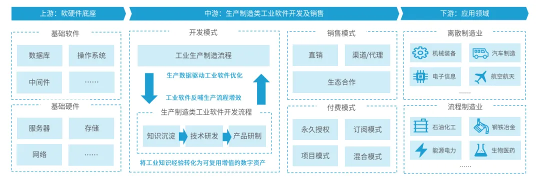 生产制造类工业软件的产业链是一个从上游基础软硬件支撑,到中游各类软件产品开发与集成,再到下游广泛应用于各工业领域的完整体系。产业链各环节紧密协同,共同支撑制造业的数字化转型。
