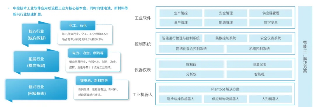 当前,工业软件业务已成为中控技术向智能制造解决方案提供商转型升级的核心增长动力,现已形成覆盖生产管控、安全环保、供应链管理、资产管理、能源管理等六大类别的产品矩阵。