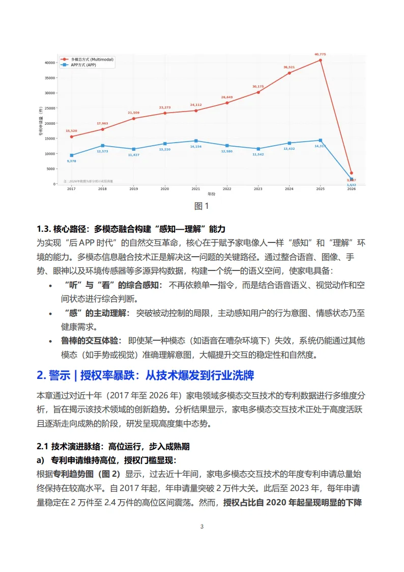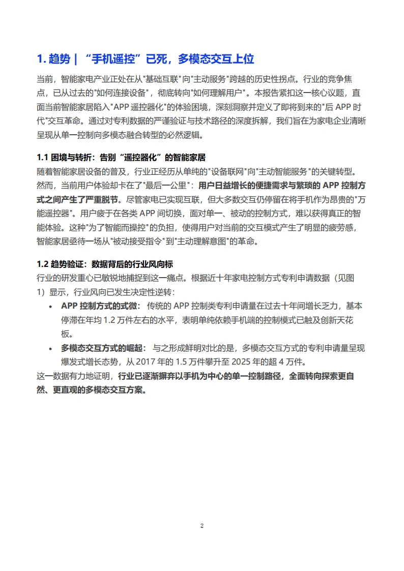 这份报告聚焦后APP时代家电行业的多模态交互技术变革,指出智能家电正从“基础互联”向“主动服务”跨越,行业竞争核心从设备连接转向用户意图理解,多模态交互成为突破当前APP遥控器化体验困境的关键。