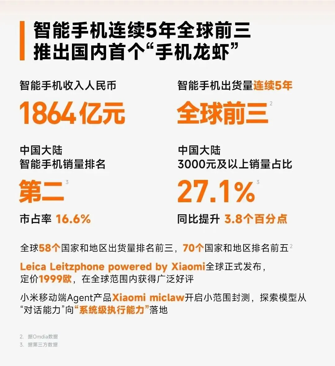 前阵子刷到小米手机的销量新闻,刚好和财报对上了,小米 2025 年智能手机出货量连续五年稳居全球前三,中国大陆销量排名第二,国内高端机销量占比达到 27.1%。 智能手机在全球 58 个国家和地区出货量排名前三,70 个国家和地区排名前五。