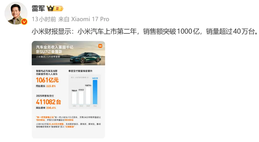 智能电动汽车及 AI 等创新业务收入 1061 亿元,同比增长 223.8%。 我当时看到汽车交付量的时候,还愣了一下,小米汽车全年新车交付 411082 台,小米 SU7 位列国内 20 万以上轿车销量冠军,小米 YU7 连续 7 个月位列国内中大型 SUV 销量第一。 新一代 SU7 开售 34 分钟锁单超 15000 台,开售 3 天锁单超 30000 台。