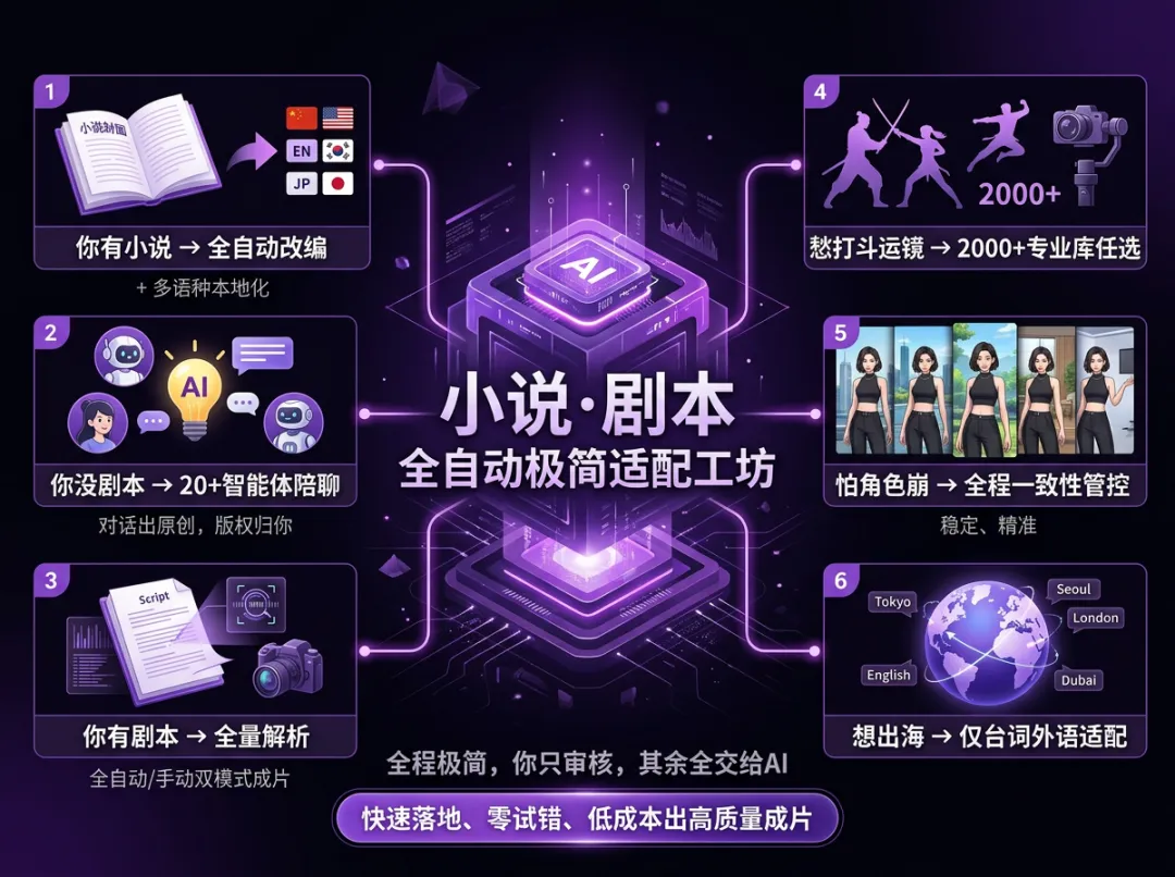 对于出海,平台没有停留在“后期翻译”,而是前置到“剧本原生创作”。创作者在开始时即可选择目标语言(如英语),系统会调用符合该语言文化语境的故事模板、概念体系(如将“修仙”转化为“Ascendant Trials”)和台词习惯进行创作。输出时,台词是对外语种,而给国内执行团队的拍摄指令仍是中文。这相当于在创作源头内置了一位“本土化编剧”,将高昂的后期重写成本降为零,让中小团队以极低成本切入全球市场成为可能。