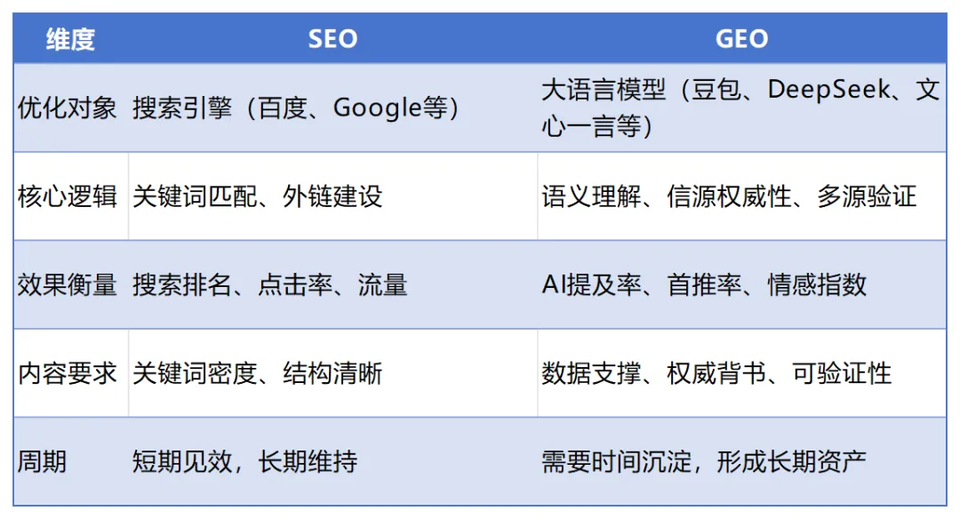 GEO(生成式引擎优化,Generative Engine Optimization)是指通过系统化的内容建设和信源布局,提升品牌在AI生成答案中的露出率和推荐优先级的策略体系。与SEO(搜索引擎优化)不同,GEO的核心不是“关键词排名”,而是 “信任构建” 。它的本质是:让AI理解你、信任你,并在回答用户问题时优先推荐你。1.2 GEO与SEO的核心区别