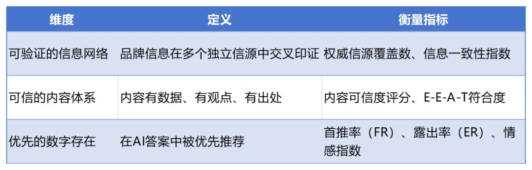 第一,长期性。一旦内容被AI收录并认定为高可信信源,将持续7×24小时自动推荐,成为品牌的长期数字资产。第二,可验证性。信任资产的增值可以被量化监测,品牌可以清楚地看到自己在AI生态中的变化。第三,抗周期性。当广告预算缩减、流量红利消退时,信任资产依然能持续产生价值。2.3 信任资产的构建逻辑