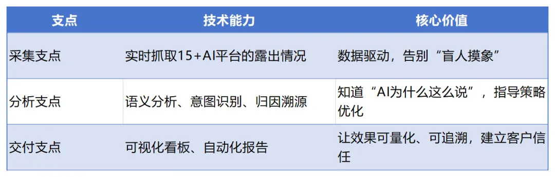 内容服务型公司能写深度内容,但不知道“写什么”和“发到哪里”才能被AI召回。- 采集支点:实时抓取15+AI平台的露出情况,知道用户怎么问、AI怎么答