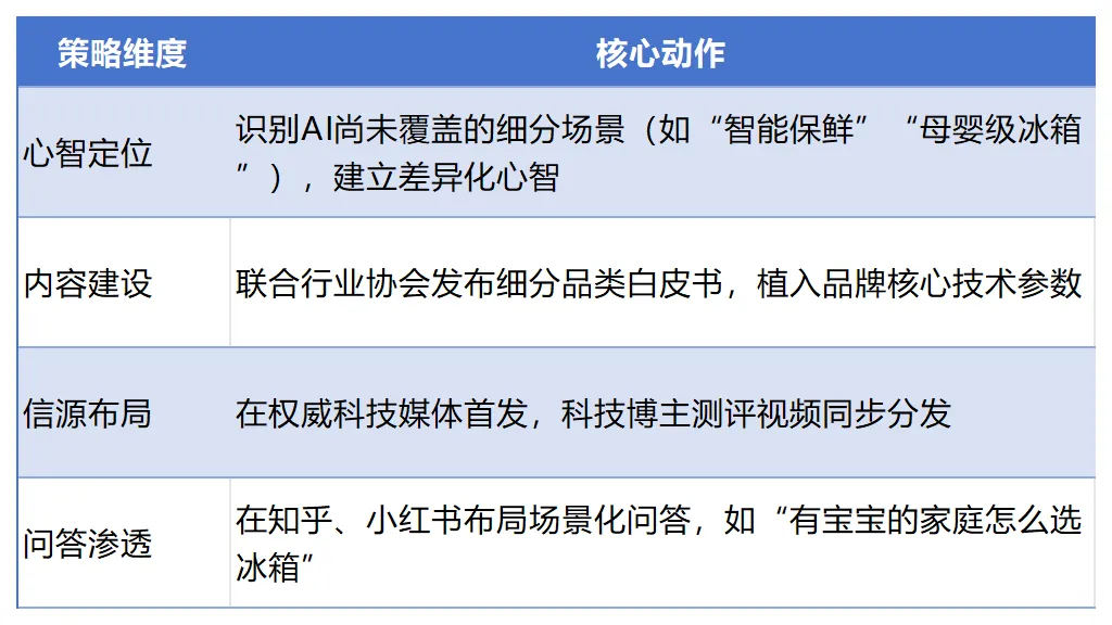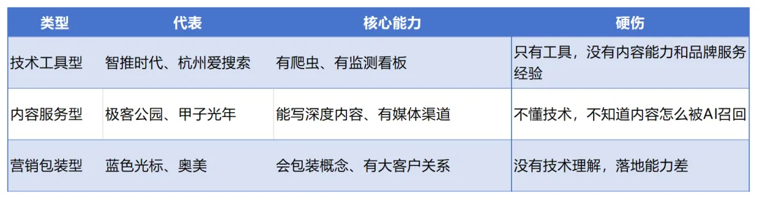 营销包装型公司能包装概念、有大客户关系,但缺乏技术理解,落地能力差。- 人告诉技术“该看什么”:策略官判断品类机会(如“智能冰箱”提问量飙升),技术系统去监测相关数据