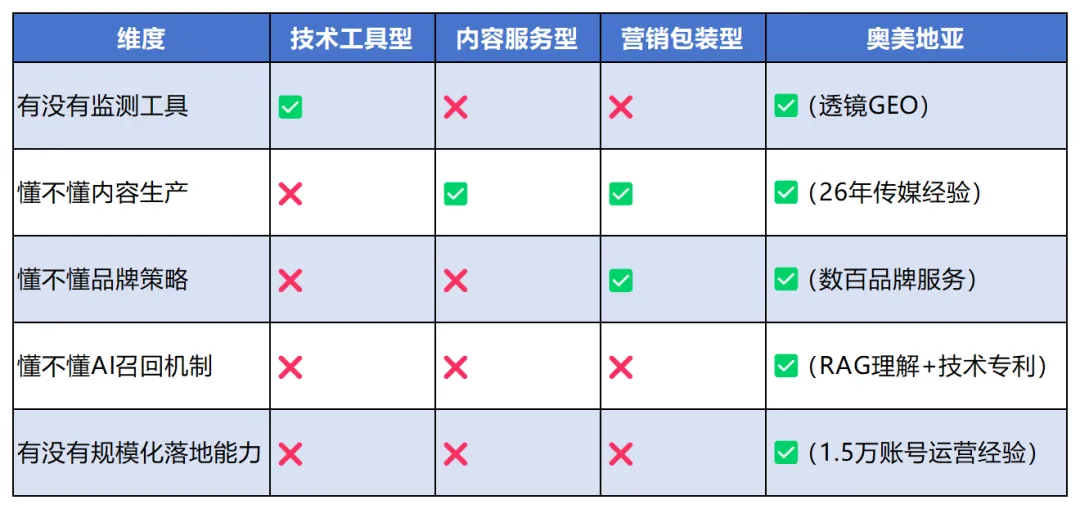 面对市场上层出不穷的“伪GEO”服务,中传奥美地亚提出三个简单可操作的鉴别维度:1.策略原点:交付的是“关键词表”,还是“用户问题地图”?