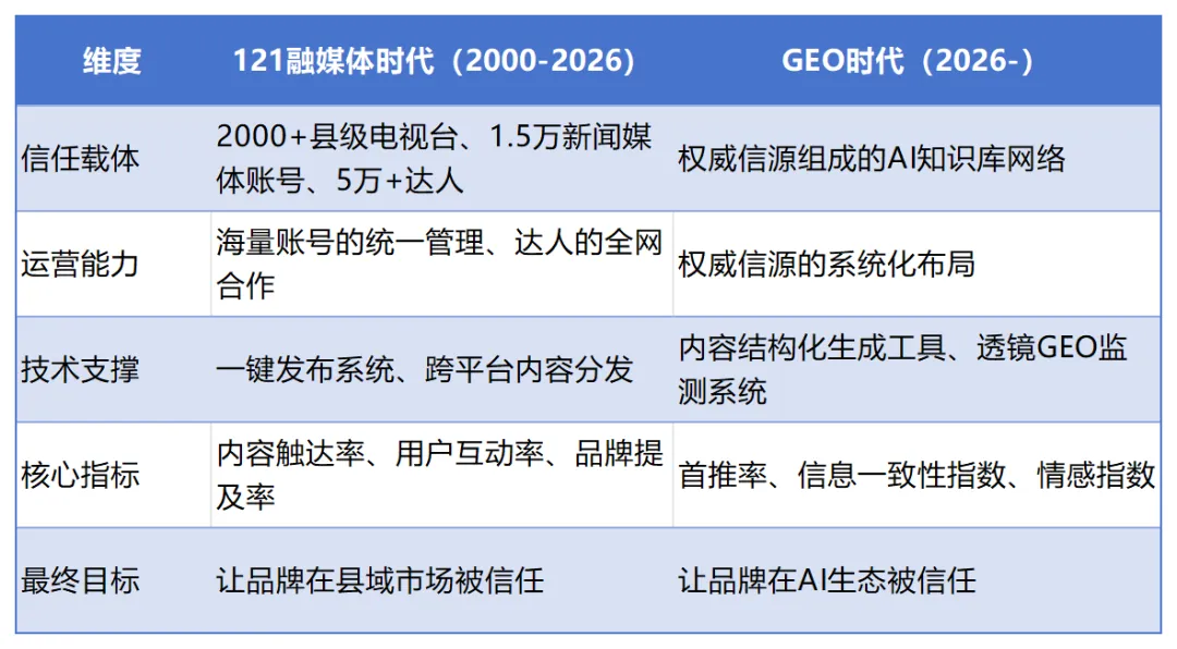 今天,AI生态就是当年的县域市场——一片全新的、充满未知的领域。信息同样不对称(品牌不知道AI怎么决策)、渠道同样混乱(伪GEO“投毒”)、信任同样稀缺(AI凭什么推荐你)。4.4 121融媒体的“信任资产”遗产