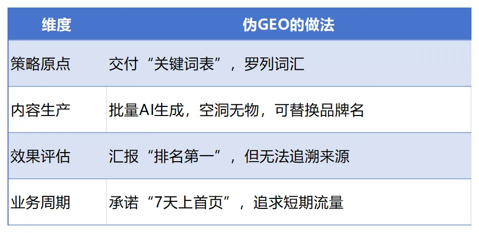 2026年3月,央视315曝光了GEO行业的“投毒”乱象。部分机构利用AIGC技术批量生成虚假内容,恶意操控AI模型的生成结果,让根本不存在的产品登上推荐榜单。5.2 真GEO的鉴别标准
